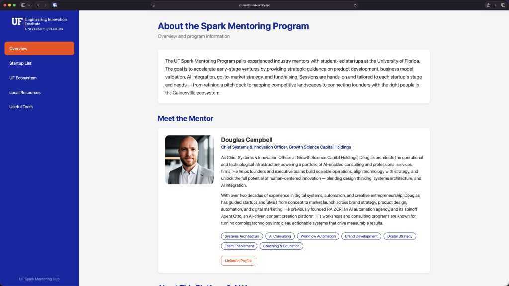 Yesterday I started a mentor role with University of Florida’s Spark – Engineering Innovation Institute. Instead of just adding ongoing notes to a hulking doc that no one would find very useful (or probably even read), I decided that a clean online interface was the only way to manage 25+ ongoing conversations while providing value AND not killing my personal time since I have only dedicated 90-120mins a week to this project. So after our first session I spent 45 minutes vibe coding a platform to keep track of future session notes, as well as a place to share resources with the student teams. And all it costs is a $20/mo Claude subscription!