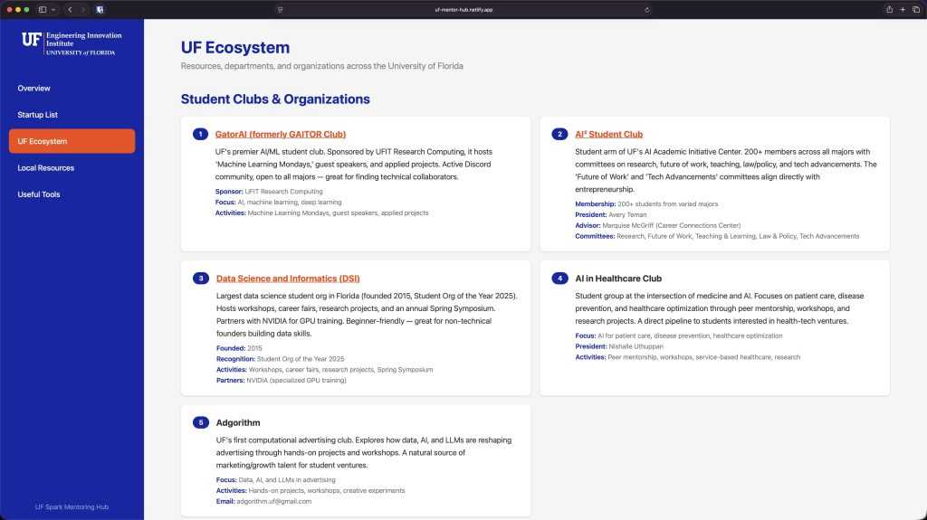 - Before our first session I spent 30 minutes chatting with Claude, gathering research on all the departments and resources inside UF, as well as local Gainesville organizations that could make for good collaborative potential.